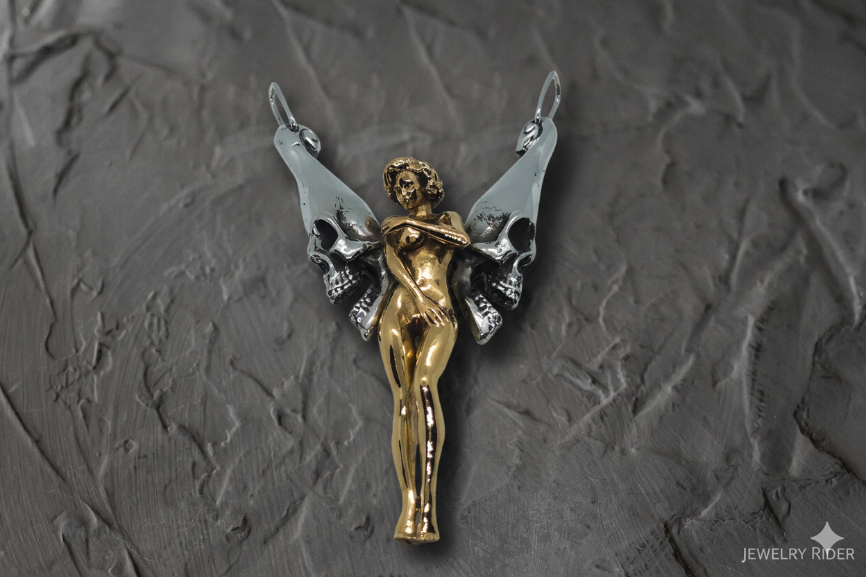 With its striking silhouette of an angel adorned with intricate skull-shaped wings, this pendant is both a symbol of strength and a work of art.