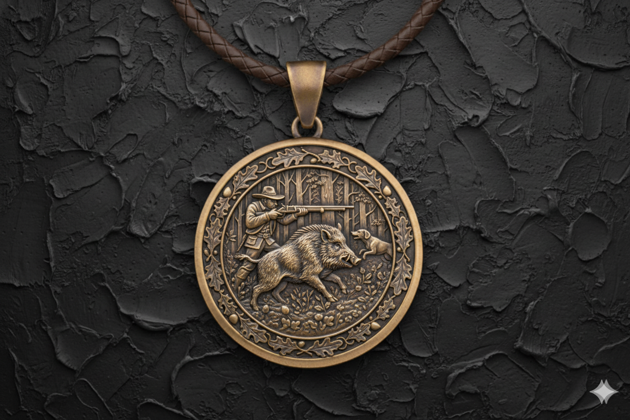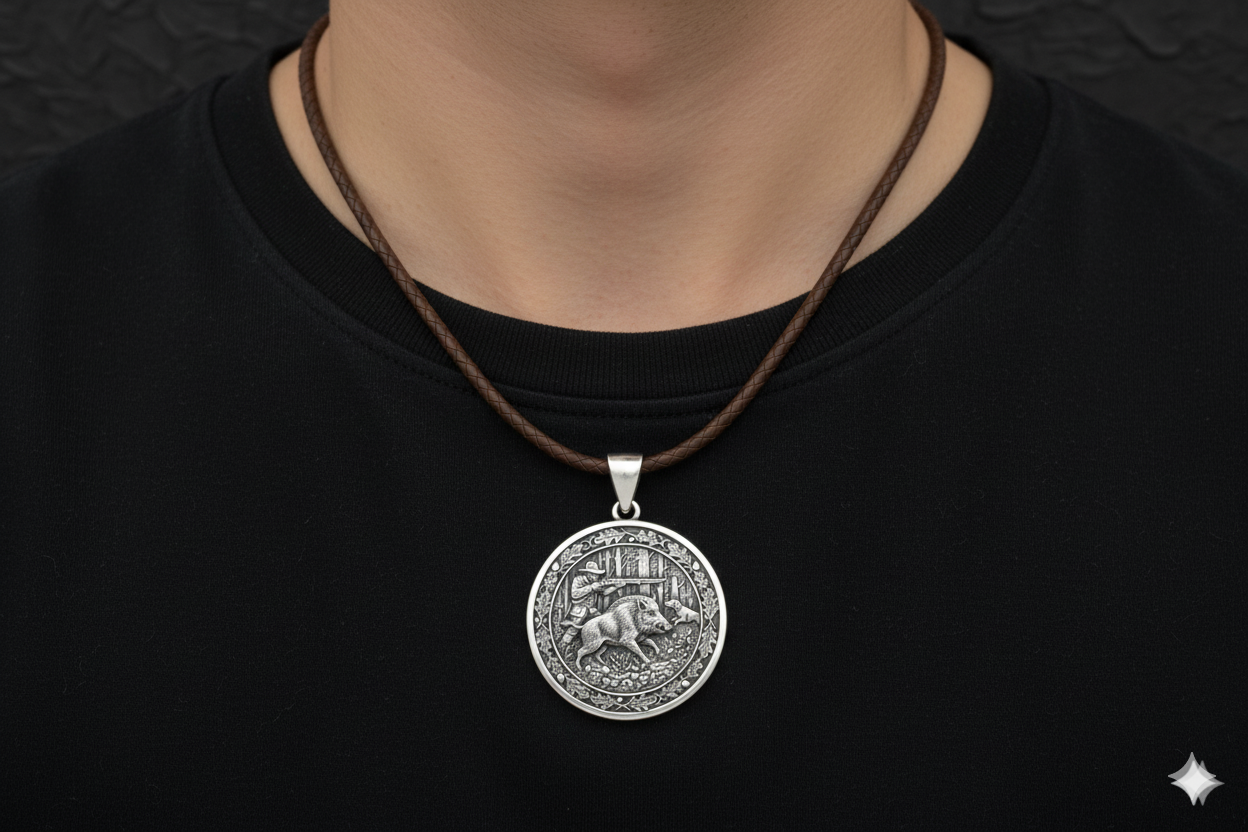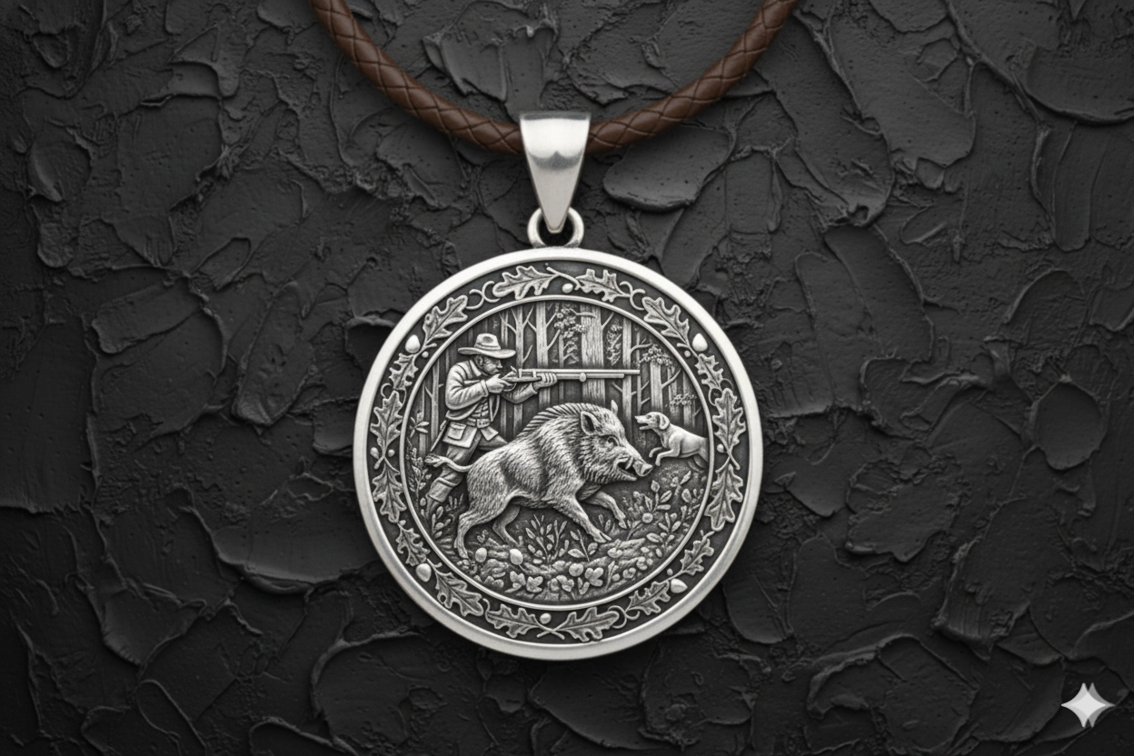 This striking 3.5cm round pendant, crafted from Sterling Silver 925 and weighing 17g, features a detailed hunting scene. A majestic Boar with impressive details is depicted in a lush forest, while a hunter takes aim with a rifle. Created by jewelryrider, this piece captures the essence of the outdoors and the thrill of the hunt.
