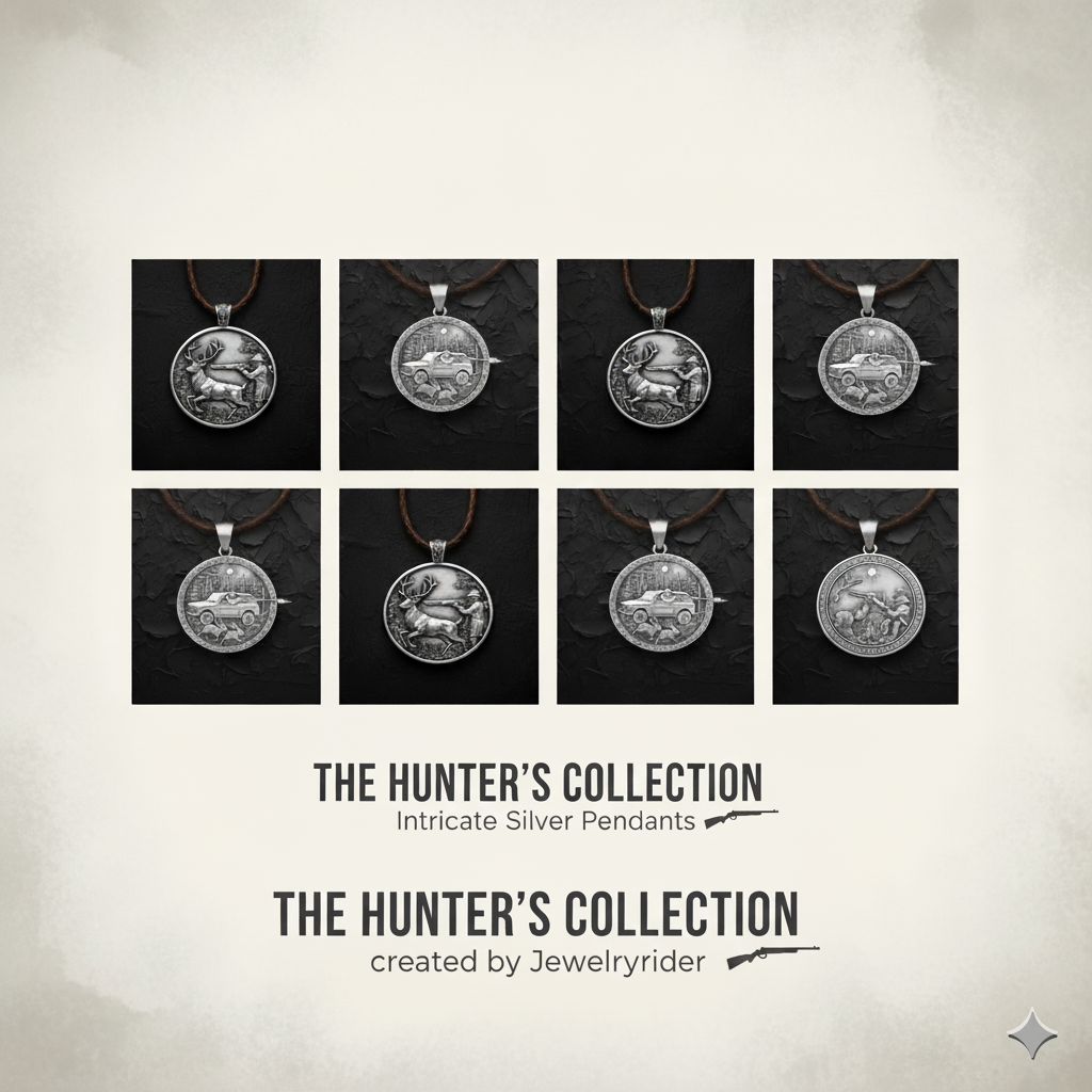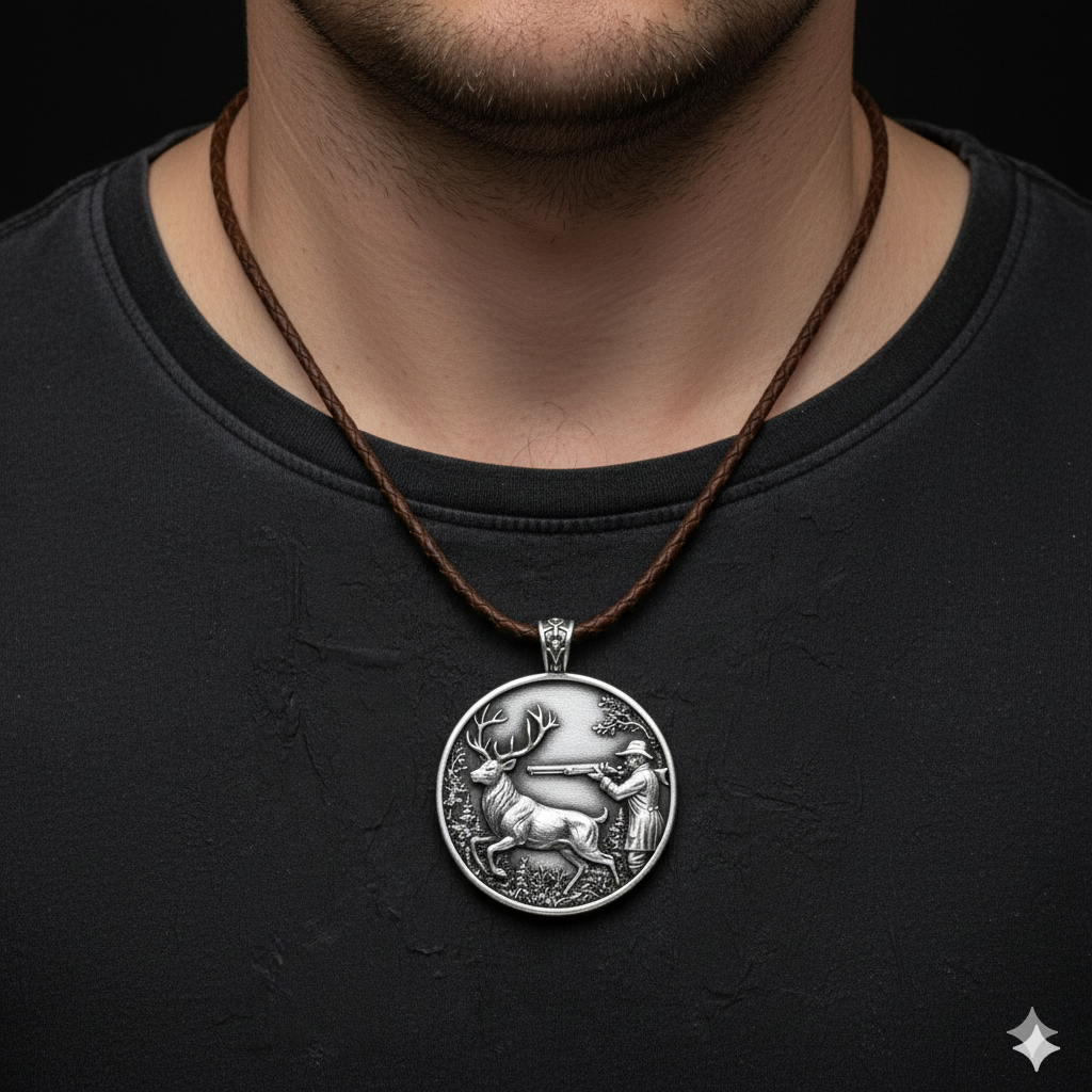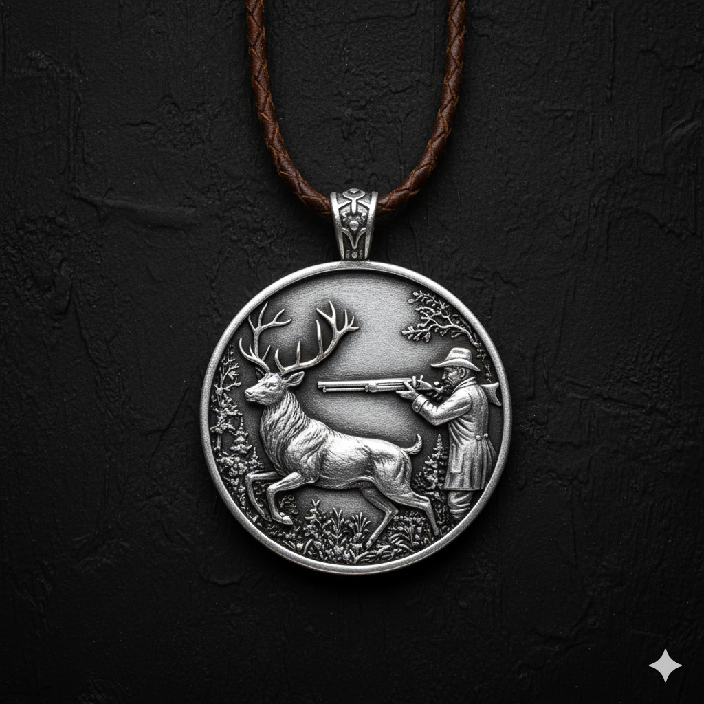 This striking 3.5cm round pendant, crafted from Sterling Silver 925 and weighing 17g, features a detailed hunting scene. A majestic deer with impressive antlers is depicted in a lush forest, while a hunter takes aim with a rifle. Created by jewelryrider, this piece captures the essence of the outdoors and the thrill of the hunt.