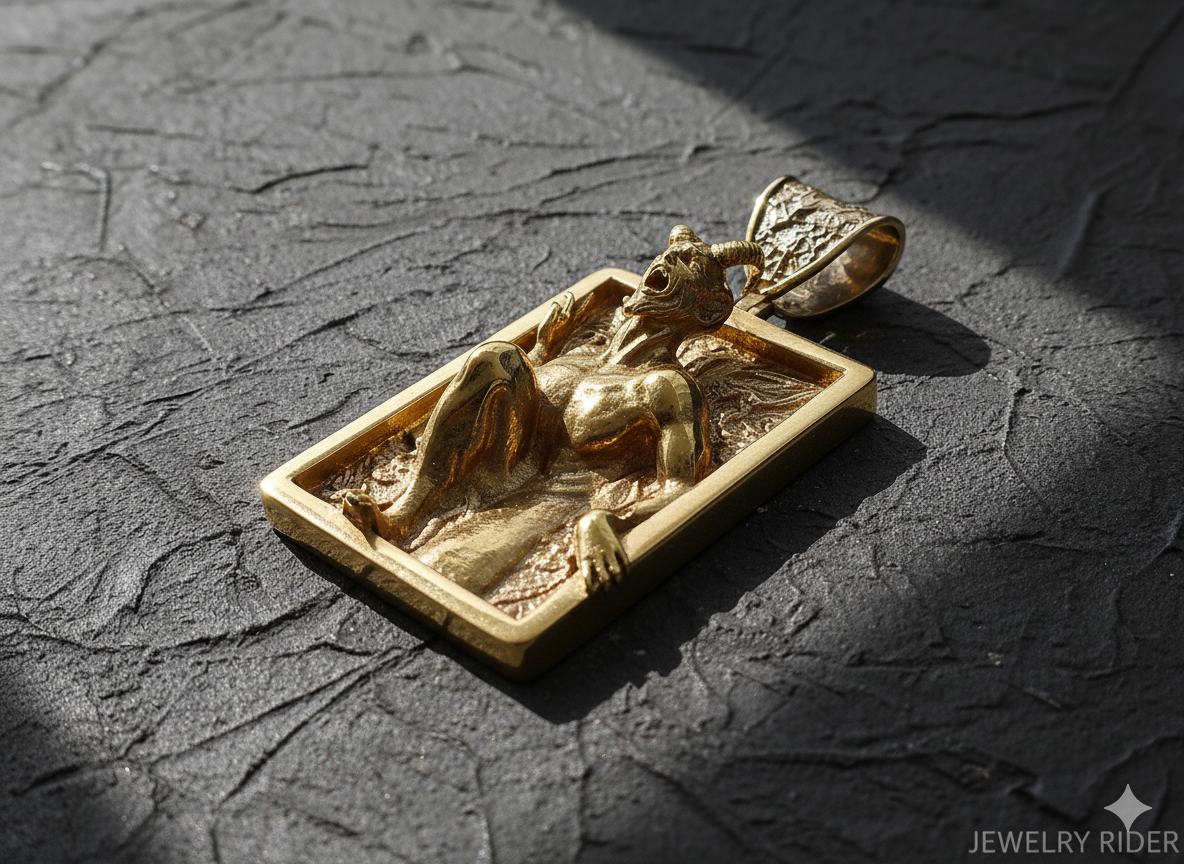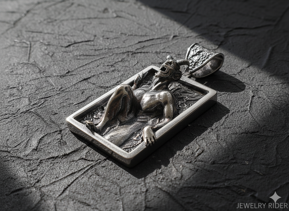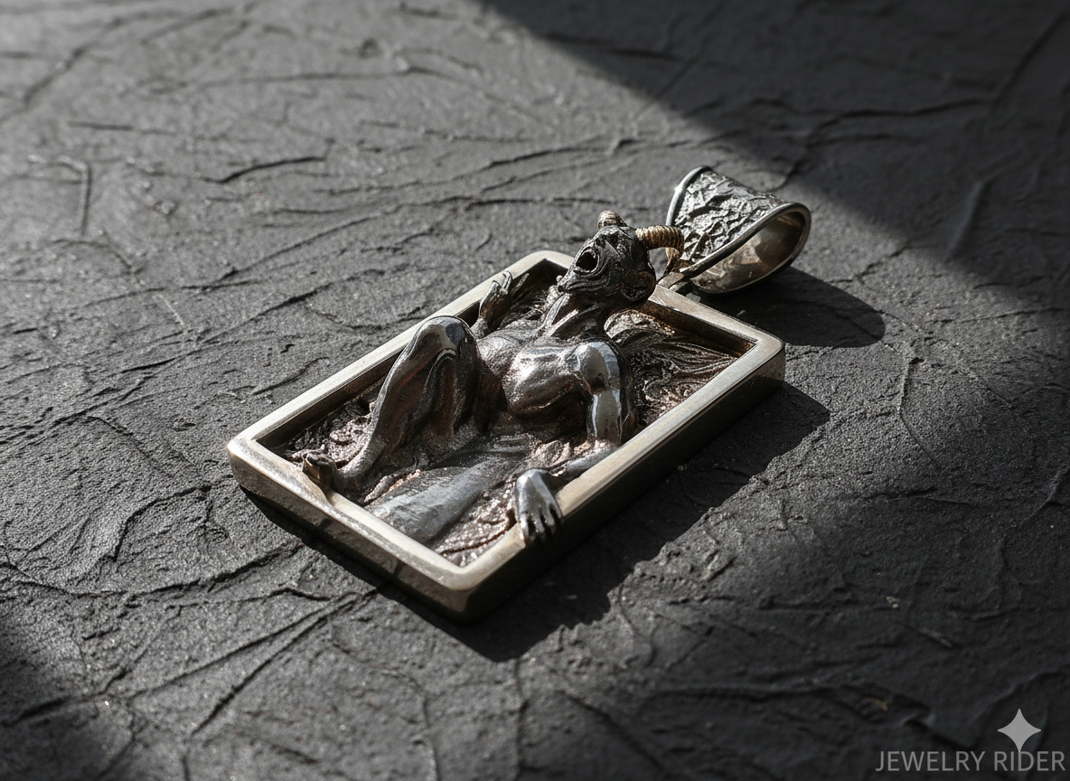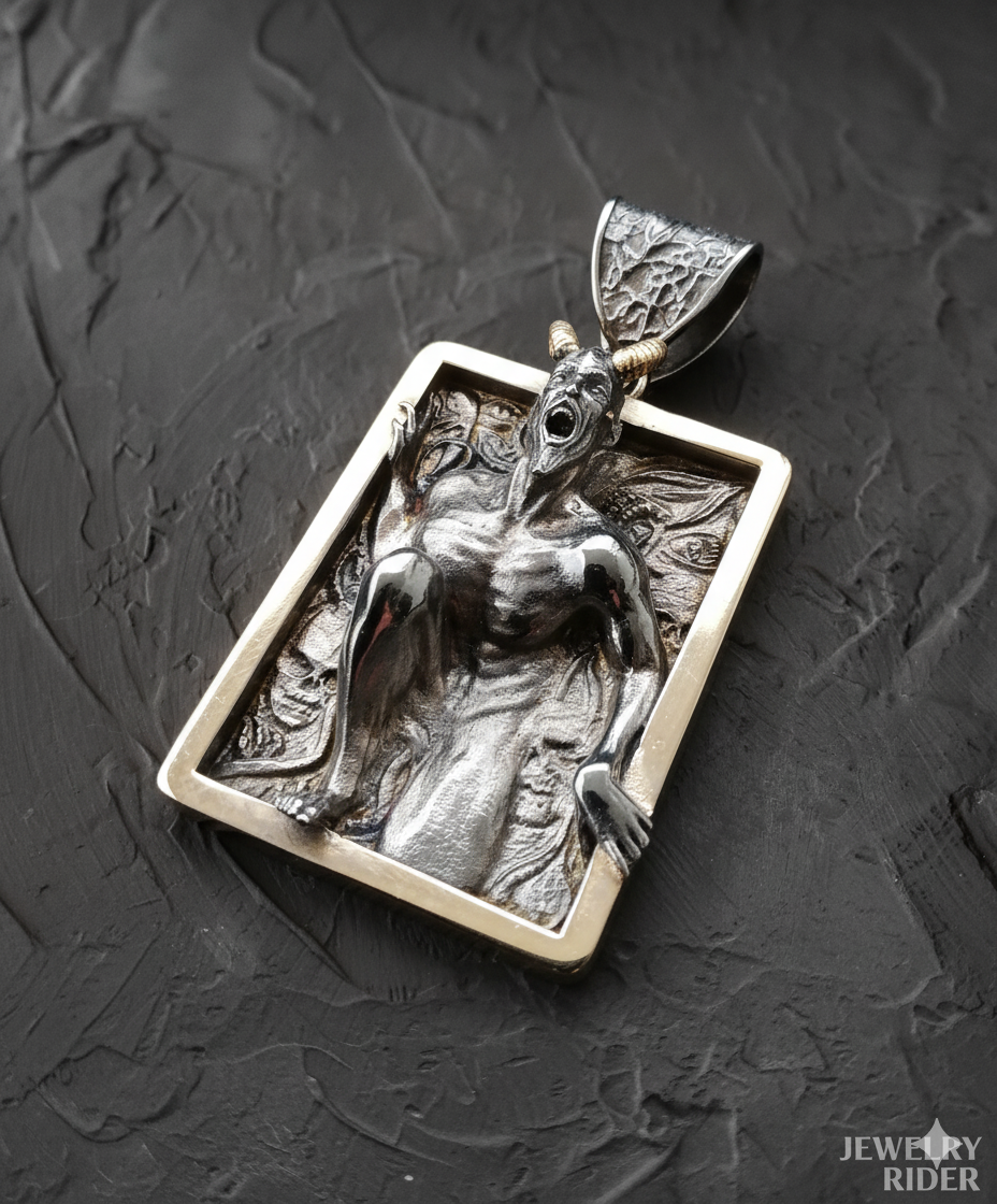 This pendant features a highly detailed 3D devil design, with intricate raised features that give it depth and dimension. The devil’s figure is sculpted with sharp features