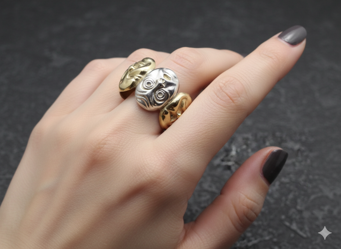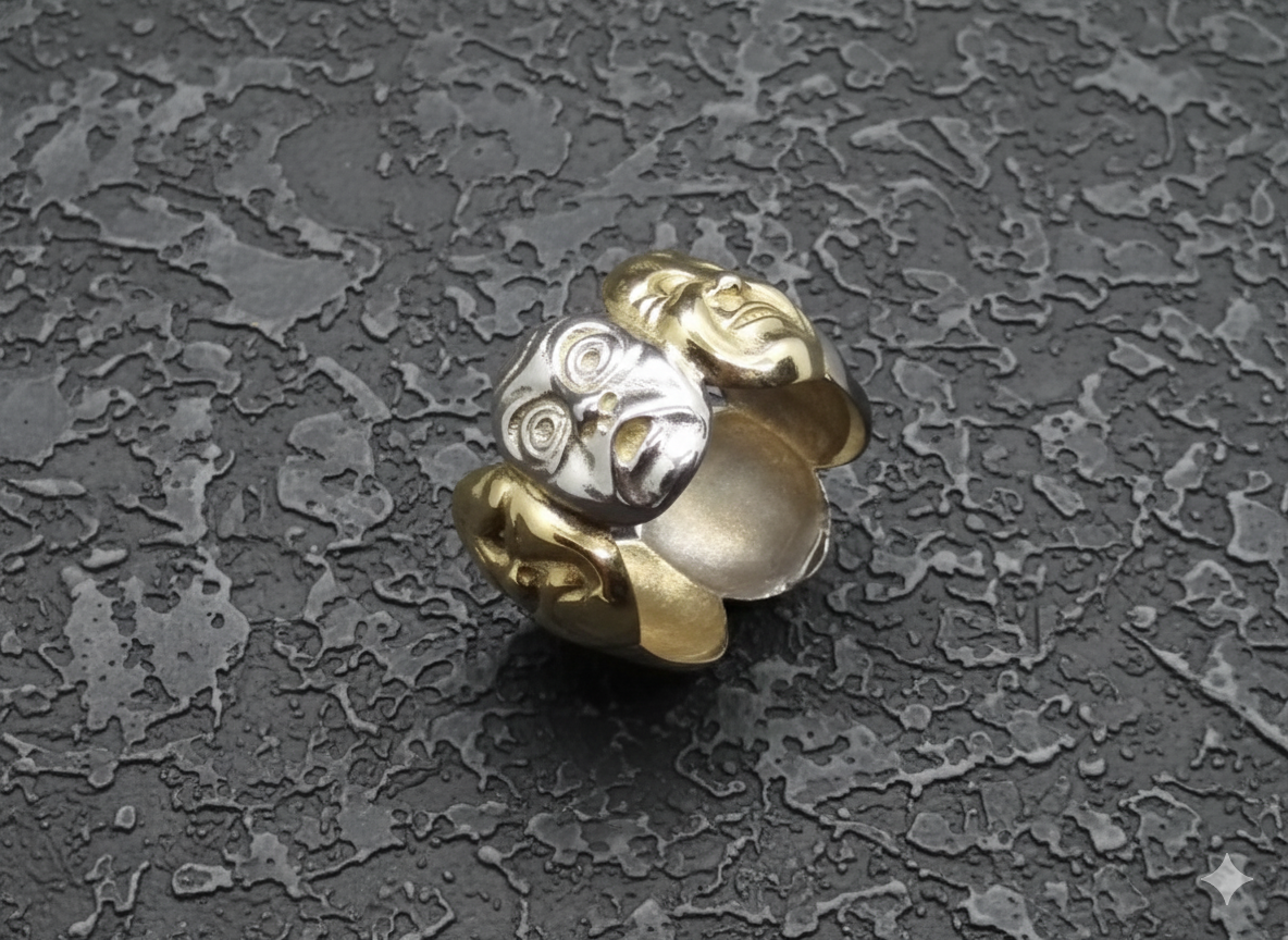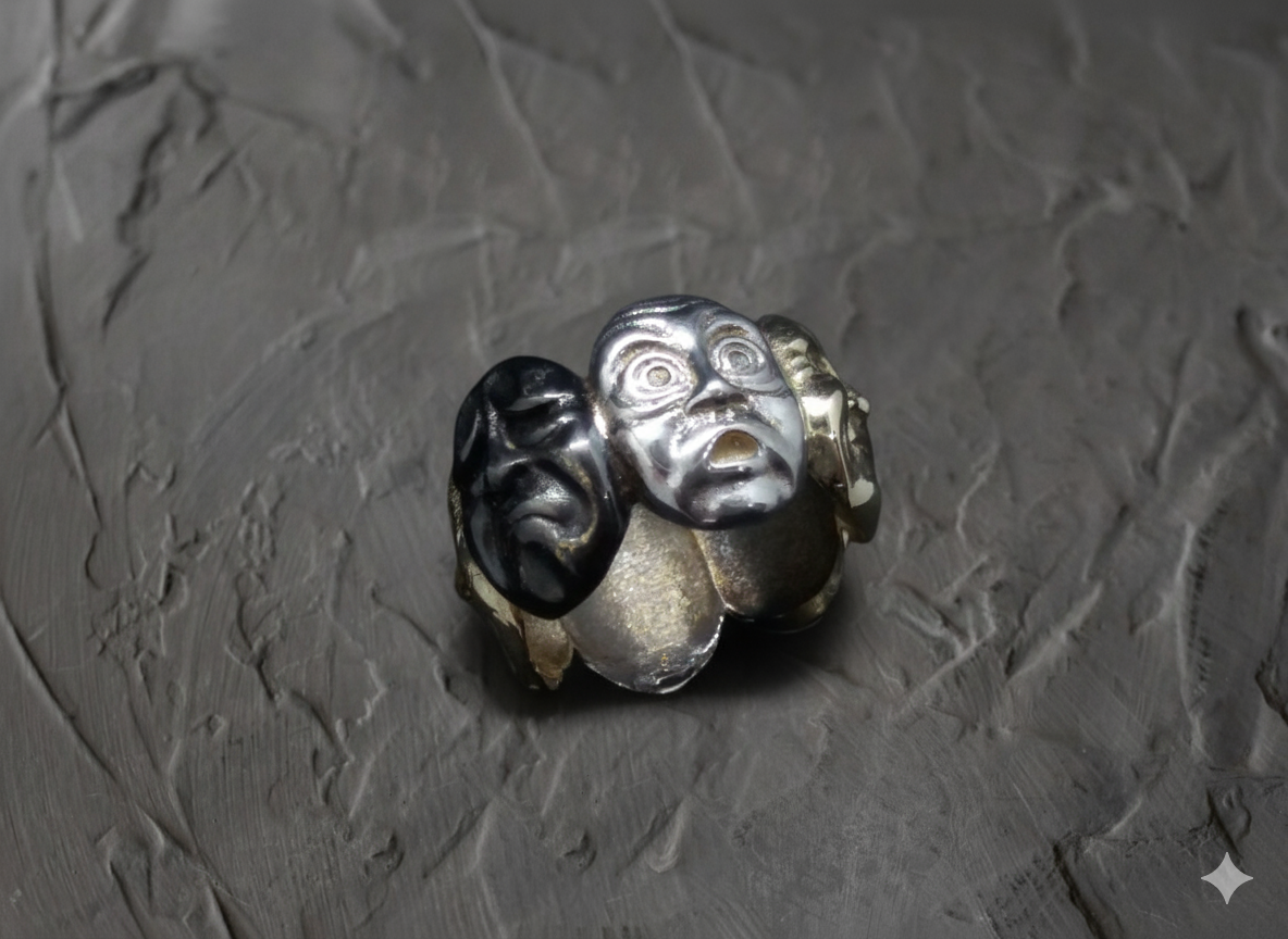 This unique ring features a collection of beautifully sculpted faces, each depicting a distinct emotion: