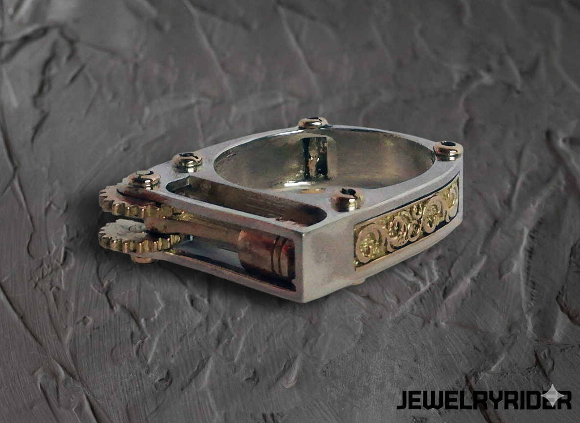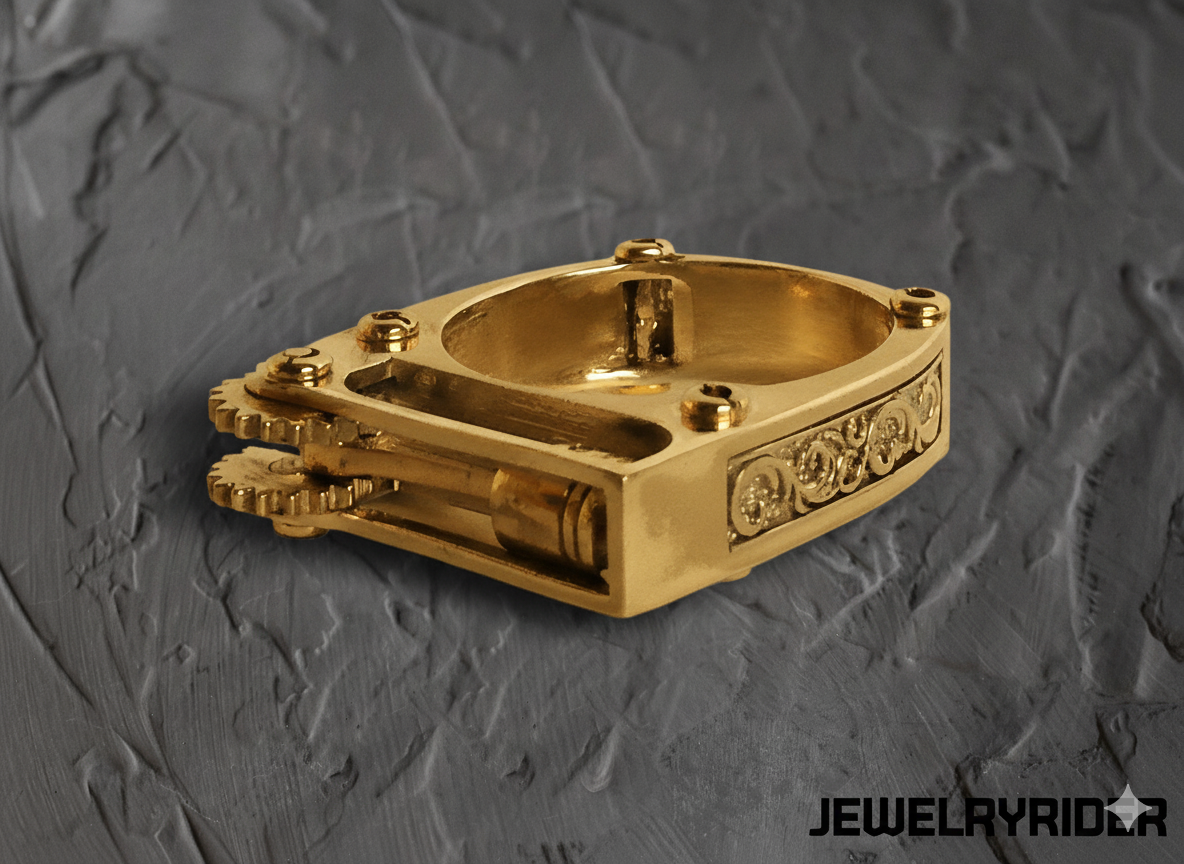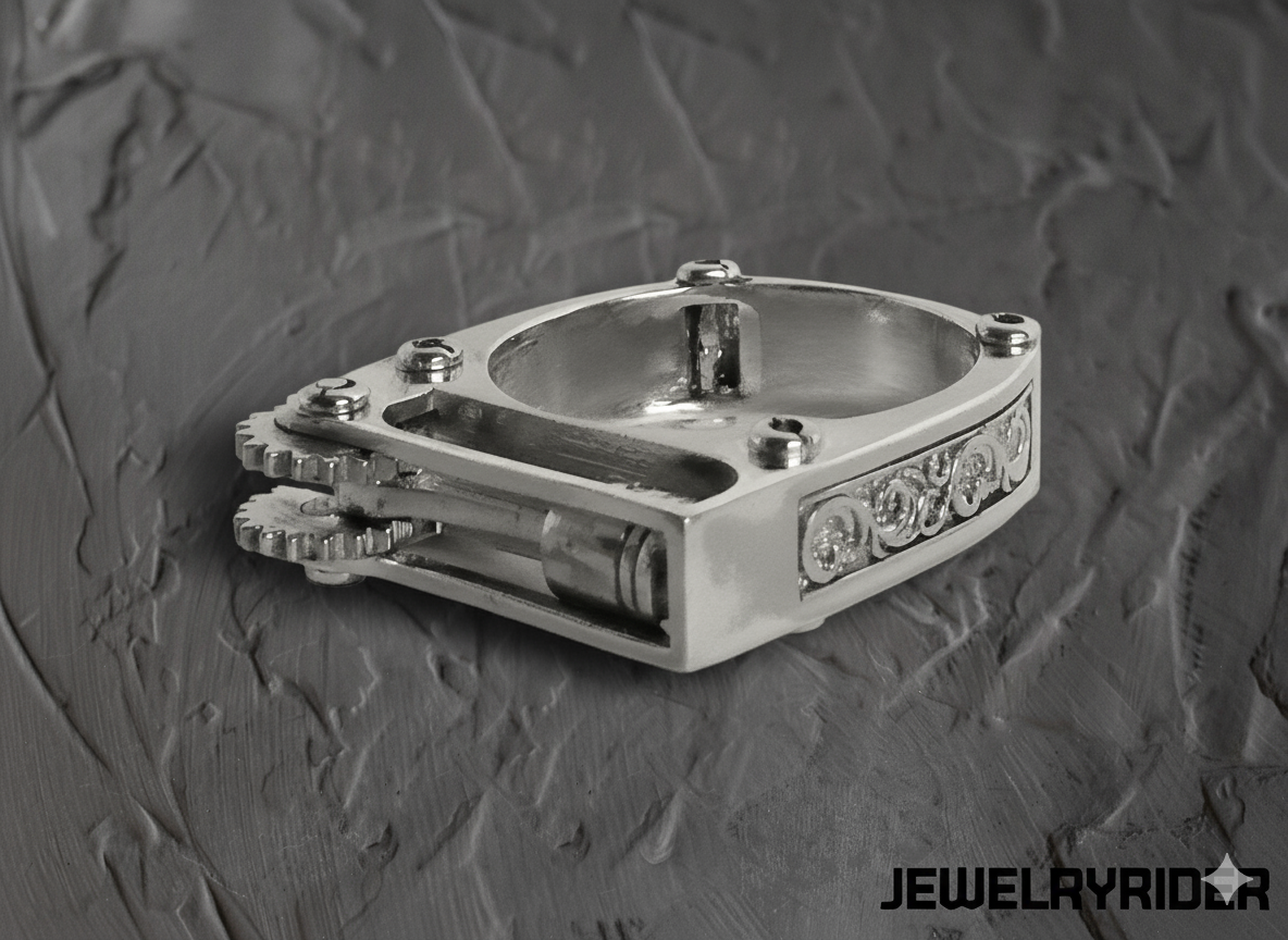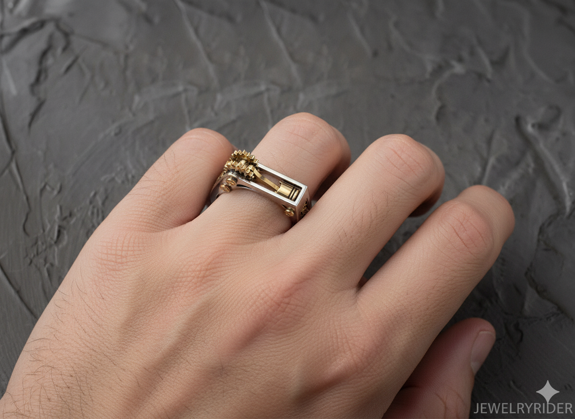 This incredible ring features a highly detailed, miniature engine working piston right on top of the band. But what truly sets it apart is its ingenious mechanical design: by simply rolling the side gears, the tiny piston moves smoothly up and down within its cylinder, completing a full 360° turn. This interactive feature transforms the ring from a static object into a fascinating kinetic sculpture, a mesmerizing piece of art that you can feel and see in motion.