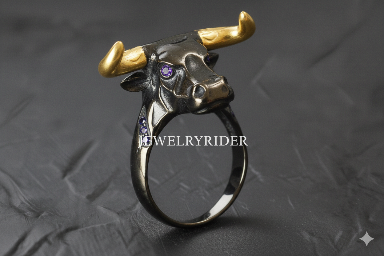 Its faceted, armor-like surface and gemstone-set eyes (customizable) give the bull a fierce, almost mythological presence — a symbol of dominance, endurance, and unwavering spirit. Whether worn as a talisman of personal strength or a bold style statement, this ring captures the essence of the beast within.