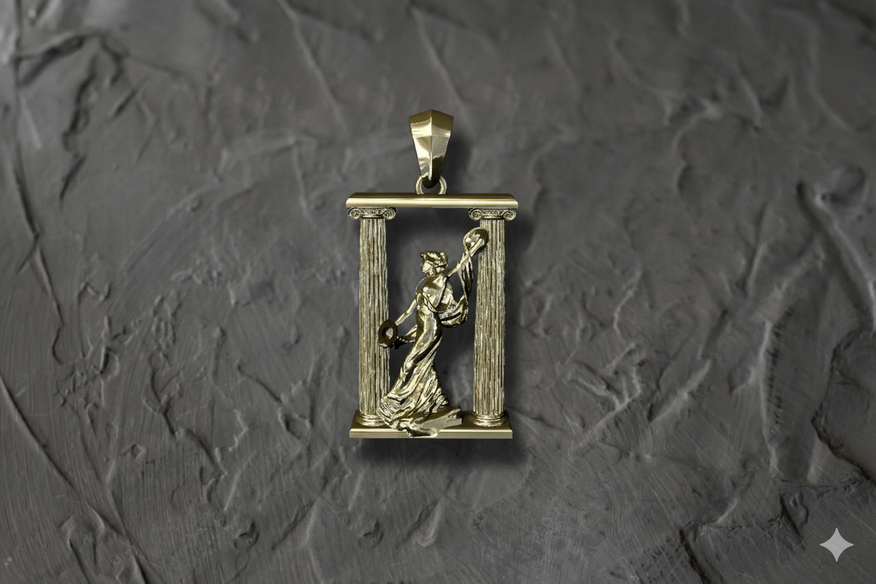 Step into the elegance of antiquity with The Dancing-Faun Under the Ionic Temple pendant where classical beauty meets timeless craftsmanship.