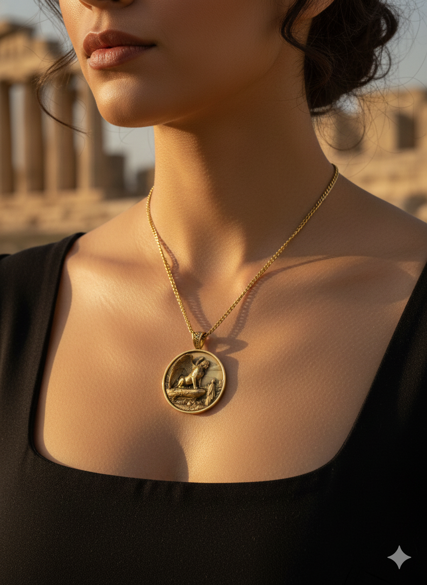 A detailed, circular silver oxidized pendant featuring a high-relief depiction of a mythological sphinx. The sphinx, with large wings and a human head with long curly hair, is posed on a rocky outcrop, facing a small robed human figure. In the background, there is a depiction of an ancient city or ruins under a cloudy sky. The medallion is surrounded by a thick, textured silver rim. The overall aesthetic is dark, ancient, and powerful.
