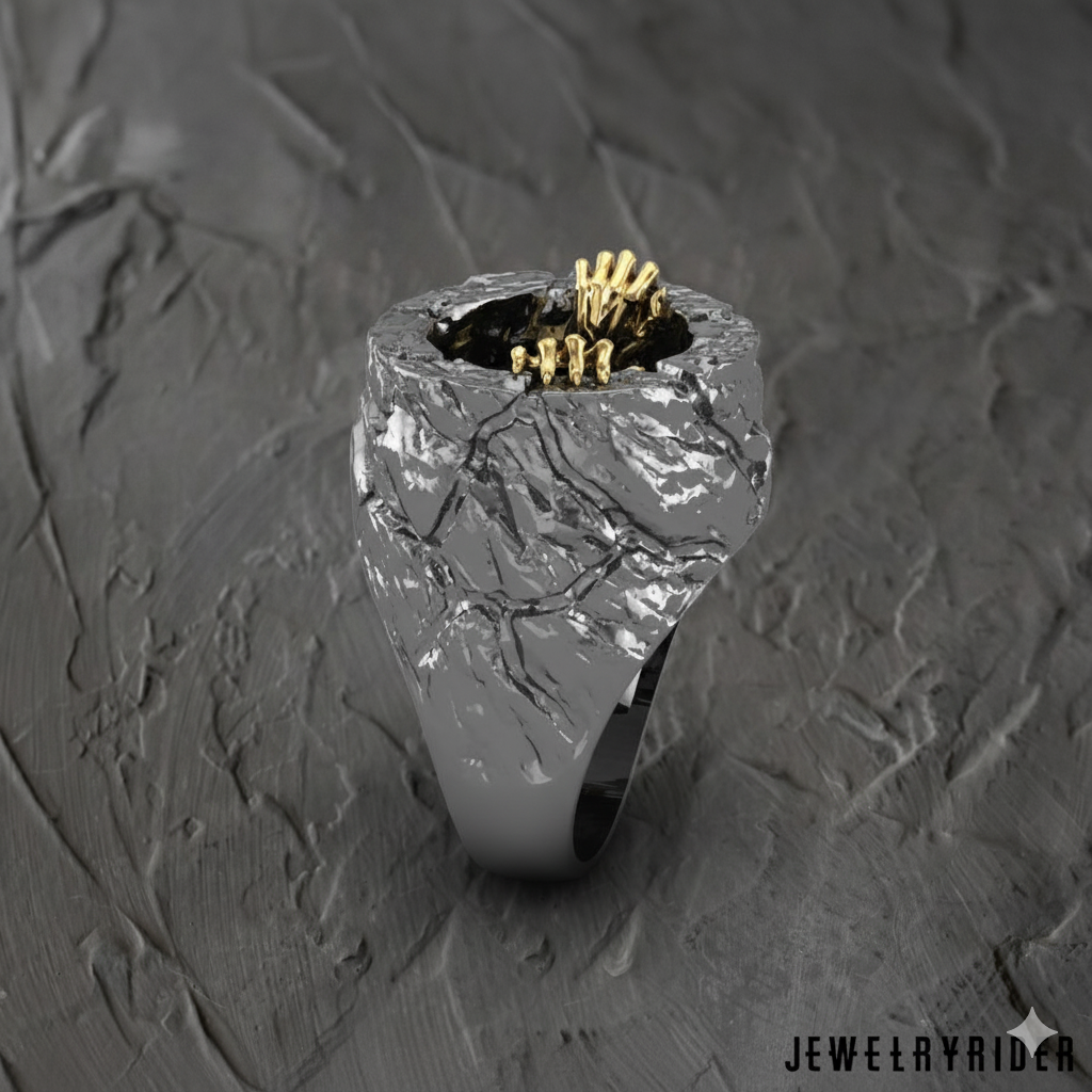 The “Underworld” Ring features a stunning, sculpted band that evokes rugged cavern walls or subterranean passages. From within this textured abyss, a pair of menacing, golden hands emerge, clutching at the edges as if guarding a hidden secret. The central focus is a hidden creature, whose piercing eyes, represented by two dazzling 1.5mm stones, gaze out from the shadows. These stones are available in a selection of mesmerizing colors: white, red, black, or blue, allowing you to personalize the creature’s gaze.